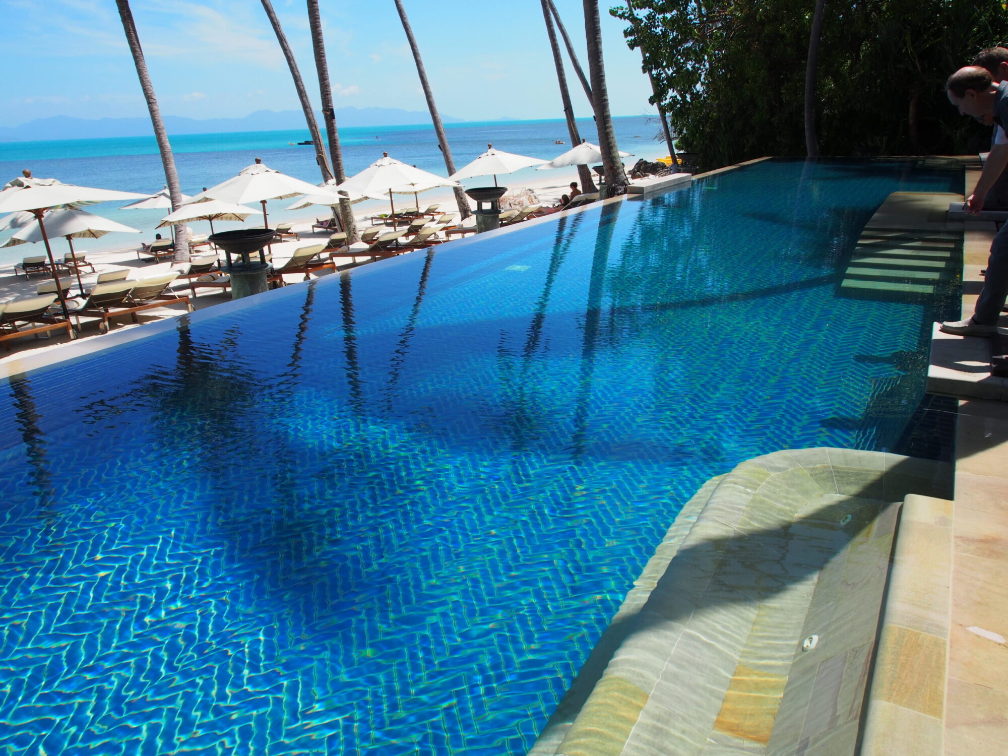 ホテル屋外プールでの使用例です。専用アンプをキャリング式にして持ち運びすることも可能です。